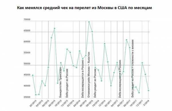 «В январе 2016 года после прекращения полетов Delta мы заметили снижение спроса на 20% и, что любопытно, снижение чека на 2,5%. В мае того же года Delta снова стала летать в Россию, и спрос сразу же вырос на 32%, а средний чек — на 3%.Но здесь важно отметить, что повышение спроса в мае — это не приход перевозчика, а просто высокий сезон на праздники. Тем же летом „Сингапурские Авиалинии“ отменили рейсы из Москвы в Хьюстон. Но поскольку направление хоть и пользовалось спросом, но спрос был специфическим, средний чек остался почти без изменений. В сентябре 2016 года Delta вновь прекратила полеты в Россию, а вместе с этим средний чек снизился на 2% и спрос — на 15%. В мае прошлого года Delta в очередной раз вернулась в Россию, однако спрос не увеличился, а упал на 4% и средний чек вырос на 5%. И, кстати, в сентябре после ухода Delta и ограничения выдачи виз стали летать на 20% реже и средний чек подрос на 0,67%», — так объясняют в компании нюансы спроса на направление.