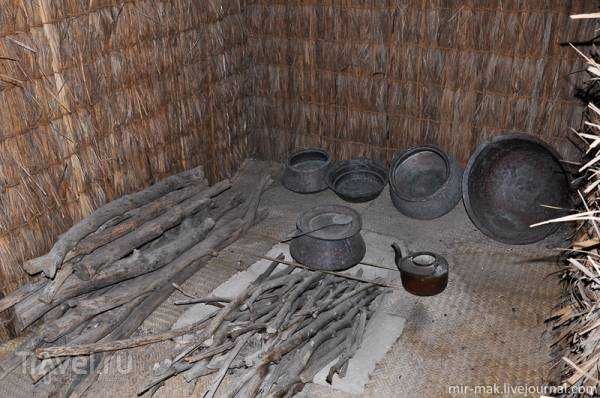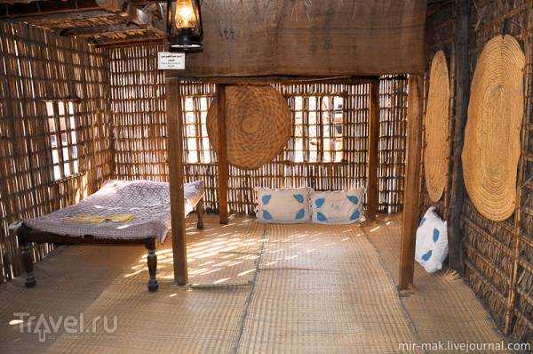 Behind the boat is a traditional Arab "barasti" house, built from palm branches. A "barjeel" wind tower rises above the house, providing air circulation and cooling in hot weather.