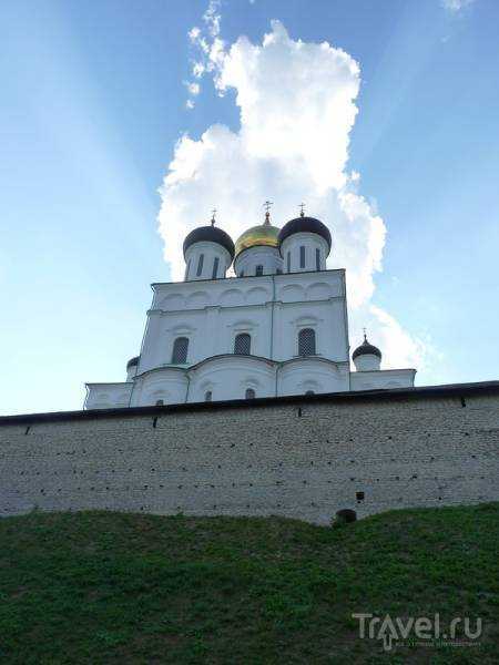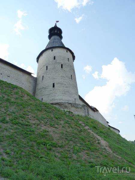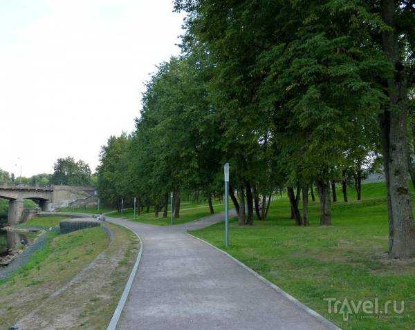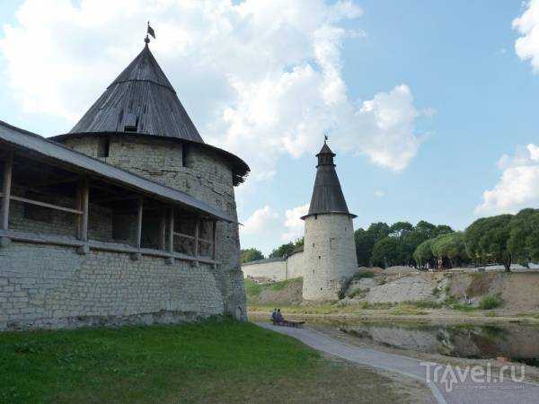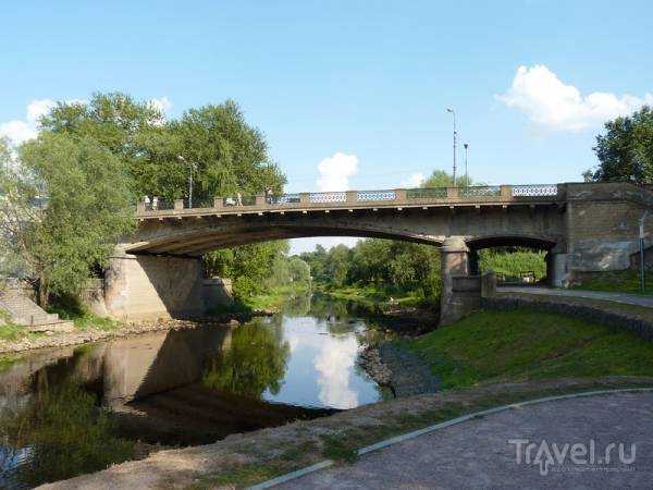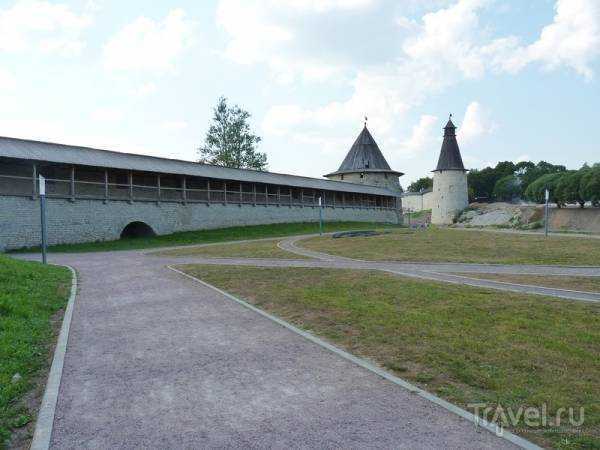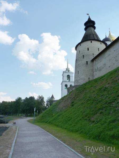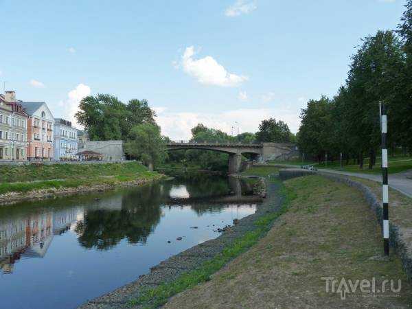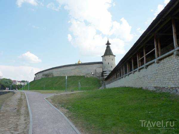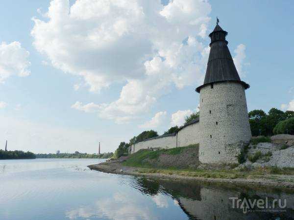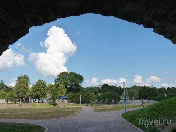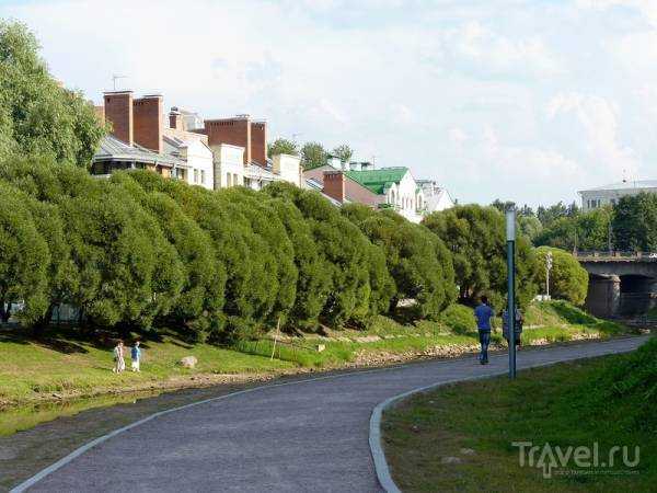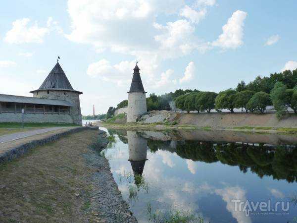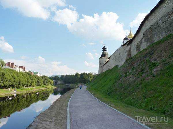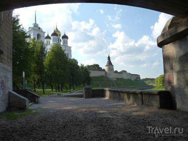 We arrived here, at the Lower Reshetki, along the Velikaya Embankment from the Olginsky Bridge. Since the Pskova River flows into the Velikaya River here, passing through a passage in the wall, we reached the Pskova Embankment, and from there we'll reach the Troitsky Bridge.