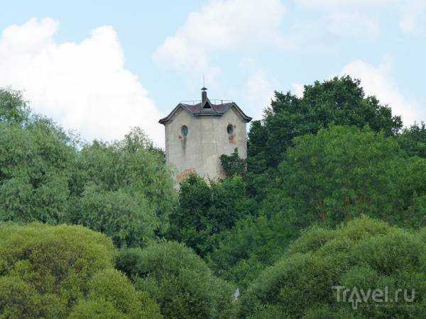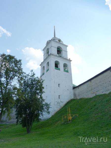 The bell tower was built on the site of an ancient tower "on Radchin Vskhod." Square in plan, it has multiple floors, topped with tiered spans of bells, a decorative tier of tower clocks, and a spire with a cross. The upper tiers were added in the 18th and 19th centuries.