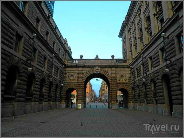 Calle Riksgatan, que discurre entre las dos alas del edificio del Parlamento sueco.