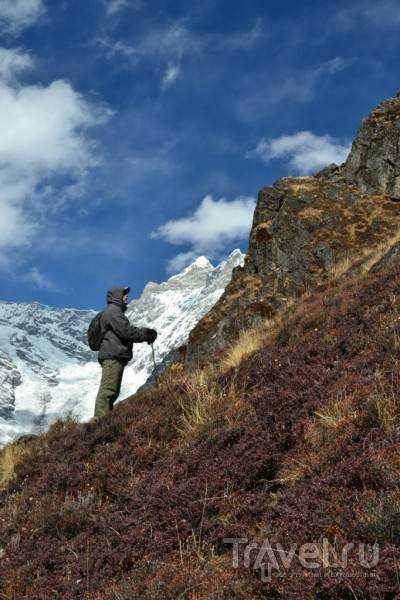 Luego emprendimos una caminata radial. Necesitamos tiempo para subir Kyazhing Ri, disfrutar de las vistas y luego descender. Viajamos ligeros, asegurándonos con bastones de alpinismo por seguridad. ¡La pendiente es muy pronunciada en algunos tramos! Hay que tener especial cuidado al bajar, atravesar con cuidado y tomarse su tiempo; de lo contrario, podrías caerte tan fuerte que no podrás recuperar los huesos.