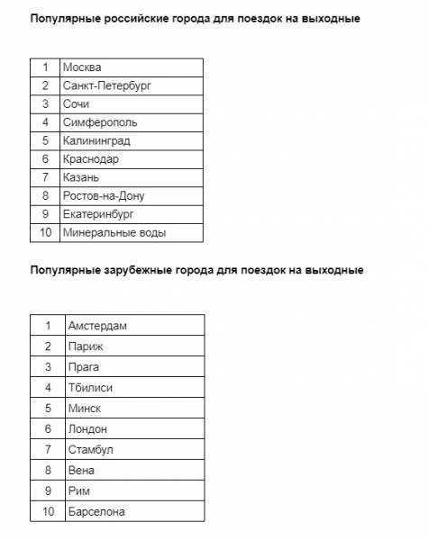По России путешественники чаще всего летают на выходные в Москву. На второй строчке расположился Санкт-Петербург. Также на уикенд россияне часто летают в Сочи, Симферополь и Калининград. Среди зарубежных городов первое место занял Амстердам.