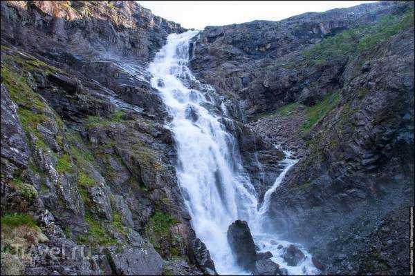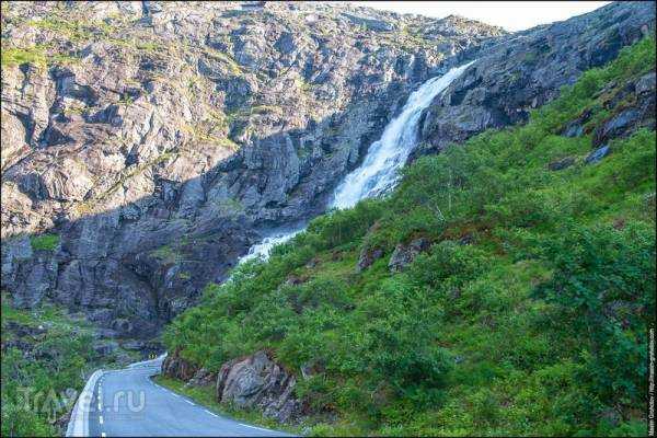 Кажется, что водопад Stigfossen разбивается о дорогу…или дорога об него. Одним словом, сердце немного замирает от неизвестности предстоящего за поворотом!