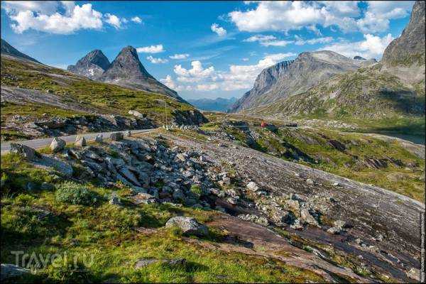 Дорога взлетела вверх по серпантину и теперь плавно движется по горному плато. Конусообразные горы на фото, нам туда, это и есть Trollstigen.