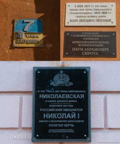 Ещё в Керчи много интересных табличек. Я сначала на это не обратил внимание, но прогулявшись понял это. Табличка с указанием дома и улицы особенно понравилась по нескольким факторам: во-первых, это флаг Украины, во-вторых, на ней показан герб Керчи. Очень достойная табличка.