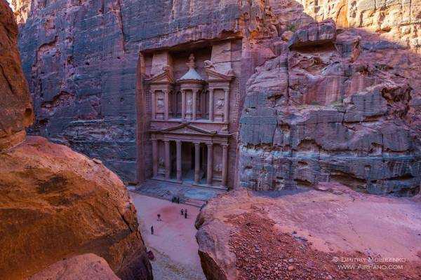 Дорога из городка была освещена в первую очередь полной Луной, и только во вторую — расставленными вдоль обочины фонариками. Я шел почти в полной тишине, не представляя, что ждет меня за очередным поворотом. Странные куполообразные скалы с вырезанными в толще камня пещерами, в которых стояли свечи, недружелюбно провожали меня горящими глазницами в охраняемый ими город мертвых. Тропа уткнулась в скалу и превратилась в узкий проход между вертикальными красными стенами. Луна уже ничего осветить не могла, и я шел по извилистому пути, долго и молча, сопровождаемый лишь тусклым светом расставленных вдоль дорожки фонариков, дуновениями теплого ветра и шорохом ящериц. Неожиданно впереди забрезжил яркий свет, через несколько метров скалы расступились, и я вышел на площадь, заставленную свечами. В центре стоял человек, в белой одежде до пят. Он медленно поднял руки, и полилась музыка флейты. Она змеей растекалась по всему пространству, проникала в расщелины, отражалась от желто-красных скал и улетала к бесконечно-звездному небу. Величественное здание, на фоне которого стоял араб — Сокровищница Фараона — доминировало над окружающим пространством. Имей оно стены — его можно было бы принять его за античный греческий храм. Но стен не было. Прямо в скале с невероятной тщательностью были вырезаны фасад, колонны, портики, статуи, ступени, ведущие ко входу в темное внутреннее помещение… Яркое пламя сотен свечей растекалось над площадью. Казалось (а может, так оно и было), что я принимаю участие в древнем языческом ритуале…