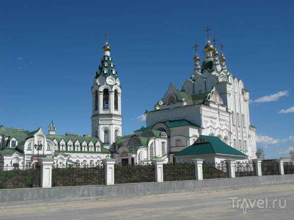 Взглянем на собор с другой стороны. Во-первых, видно, что к нему вплотную примыкает новый центр Йошкар-Олы. Во-вторых, слева на кадре, перед собором, мы видим дом купца Пчелина — старейшую гражданскую постройку города. Пчелины — наиболее известная и богатая династия царевококшайских купцов. Именно на средства купца Пчелина рядом с его усадьбой и был построен собор Вознесения Господня. Я почему-то не сфотографировал его отдельно. Кстати, чуть-чуть его видно и на предыдущем фото, слева.