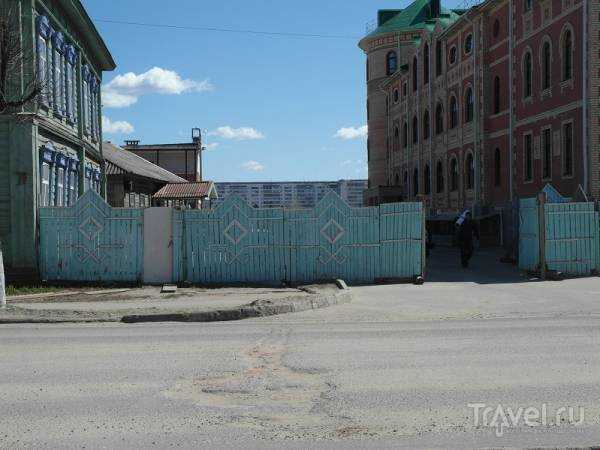 На фото за синим забором — бывший жилой корпус всё того же Богородице-Сергиевского монастыря, конец XIX-го века, через дорогу от монастырской школы. Выглядит как барак: