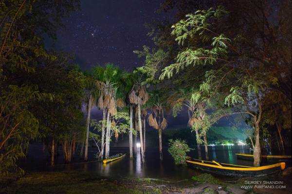 Солнце уже почти спустилось к горизонту, а нам нужно еще вернуться к лодке… Вновь проходим туннель под водопадом, снова душ, спуск к лагуне, и вот деревянная лодка с мощным мотором мчит нас обратно. В экваториальных широтах темнеет быстро; причаливаем уже в темноте. Ветер колышет верхушки пальм, над ними проступают яркие звезды.