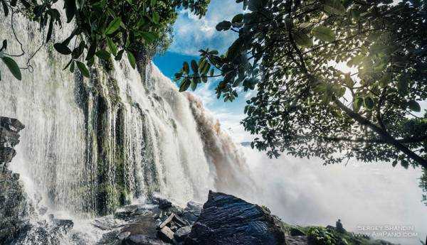 Преодолев мокрый и скользкий подъем, опутаннный лианами и корнями, выходим на каменистую ровную скалу. Отсюда отлично видны водопад и вся лагуна. Стас запускает дрон, мы делаем несколько проходов на разных высотах, иногда опуская аппарат почти до кромки водопада. Мощные струи воды разбиваются брызгами, образуя красивые радуги.