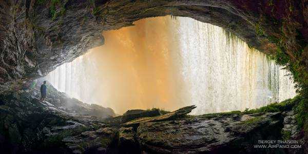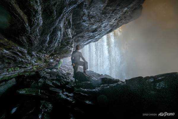 И на следующий день мы снова не дождались вертолета, поэтому опять отправились к водопаду, уже лучше подготовившись к съемкам внутри водяного грота. Вода в водопаде довольно теплая, но воздух в гроте почти не нагревается солнцем, поэтому пару раз мы выходили наружу погреться.