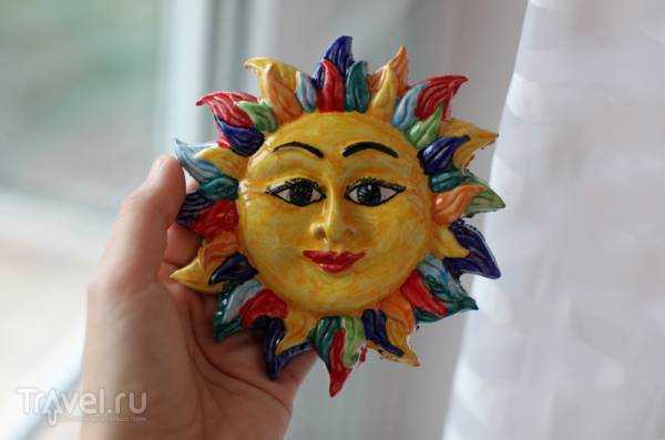 А еще в Чефалу я неожиданно для самой себя начала вдруг собирать сувенирные керамические изделия. И причем на очень узкую тематику: солнце. Идею я подсмотрела как раз на нашей вилле, там на кухне вся стена была украшена радостными солнцами различных размеров, цветов и форм. И так мне понравилось, что на следующий день я уже бегала по магазинчикам керамики и искала для себя красивое солнце… Никогда бы не подумала! Я обычно ко всем этим сувенирным вещам с некоторым пренебрежением отношусь и никогда не покупаю ничего ненужного.